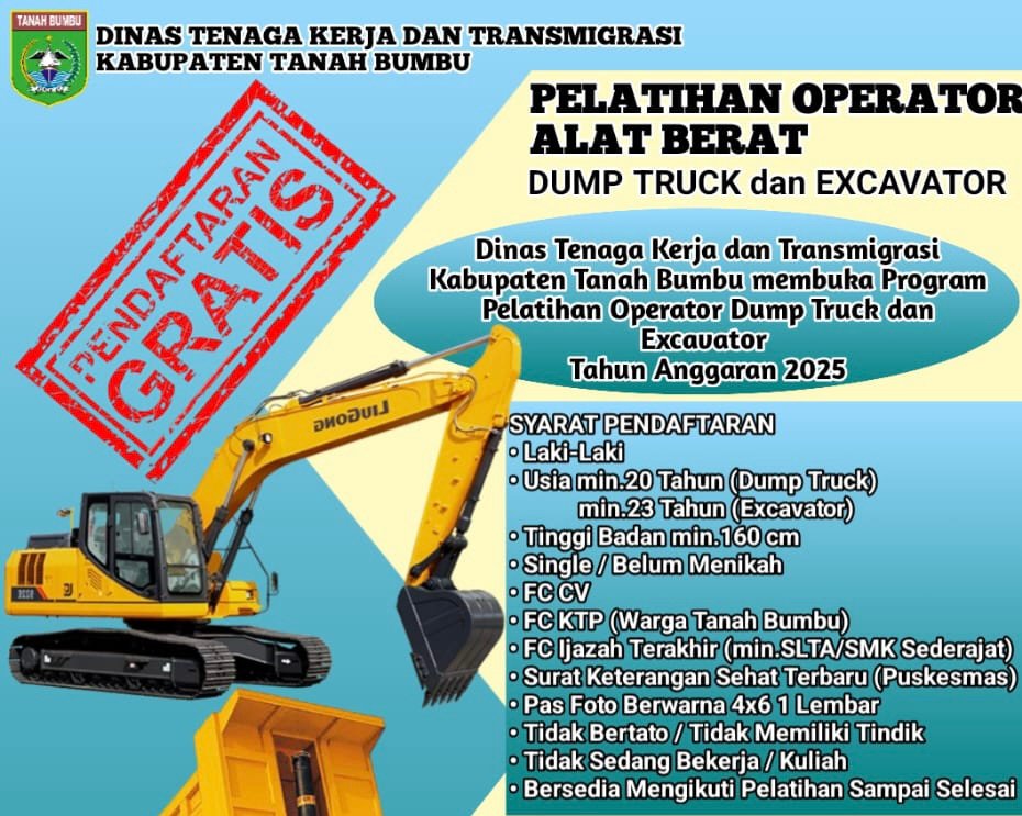 Banua Voice, Tanah Bumbu – Dinas Tenaga Kerja dan Transmigrasi (Disnakertrans) Kabupaten Tanah Bumbu membuka pendaftaran program pelatihan gratis bagi calon operator alat berat Dump Truck dan Excavator. Program ini merupakan bagian dari upaya pemerintah daerah untuk meningkatkan kompetensi tenaga kerja lokal pada Tahun Anggaran 2025.
