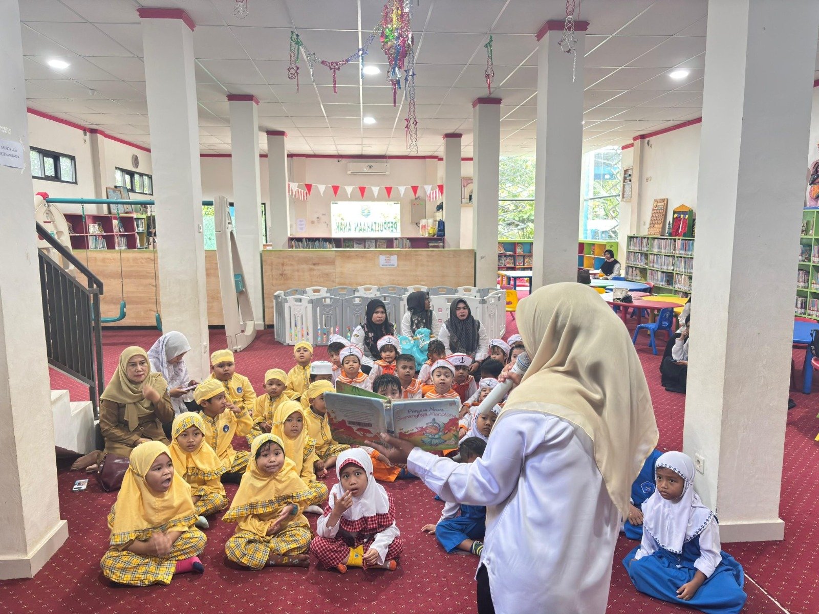 Bertempat di ruang baca Dispersip Kotabaru, Senin (15/9/2025), anak-anak dari tiga Taman Kanak-kanak (TK) yaitu TK Al Hidayah Fajar, TK Sinar Laut, dan TK Al Muslimun Mandin, mengikuti sesi bercerita yang dibawakan oleh pendongeng Kak Yanti.