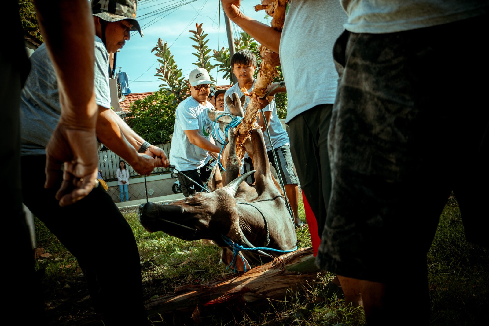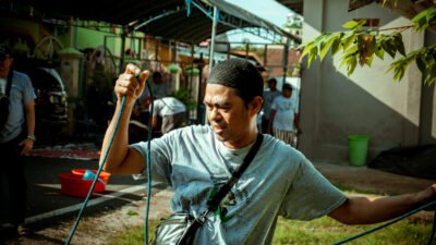 Tak hanya dalam aksi, momen kebersamaan ini juga diabadikan secara visual oleh Atif Almirza Kadafi, seorang seniman visual digital yang telah lama berkarya di berbagai penjuru—dari Papua hingga Afrika. Atif menangkap suasana qurban di RT 33 dalam satu jepretan dokumenter yang kuat dan menyentuh. Gayanya yang khas, perpaduan antara nuansa sinematik dan kejujuran realita, menghasilkan foto yang terasa seperti potongan adegan film dokumenter kelas festival—hidup, utuh, dan penuh cerita.